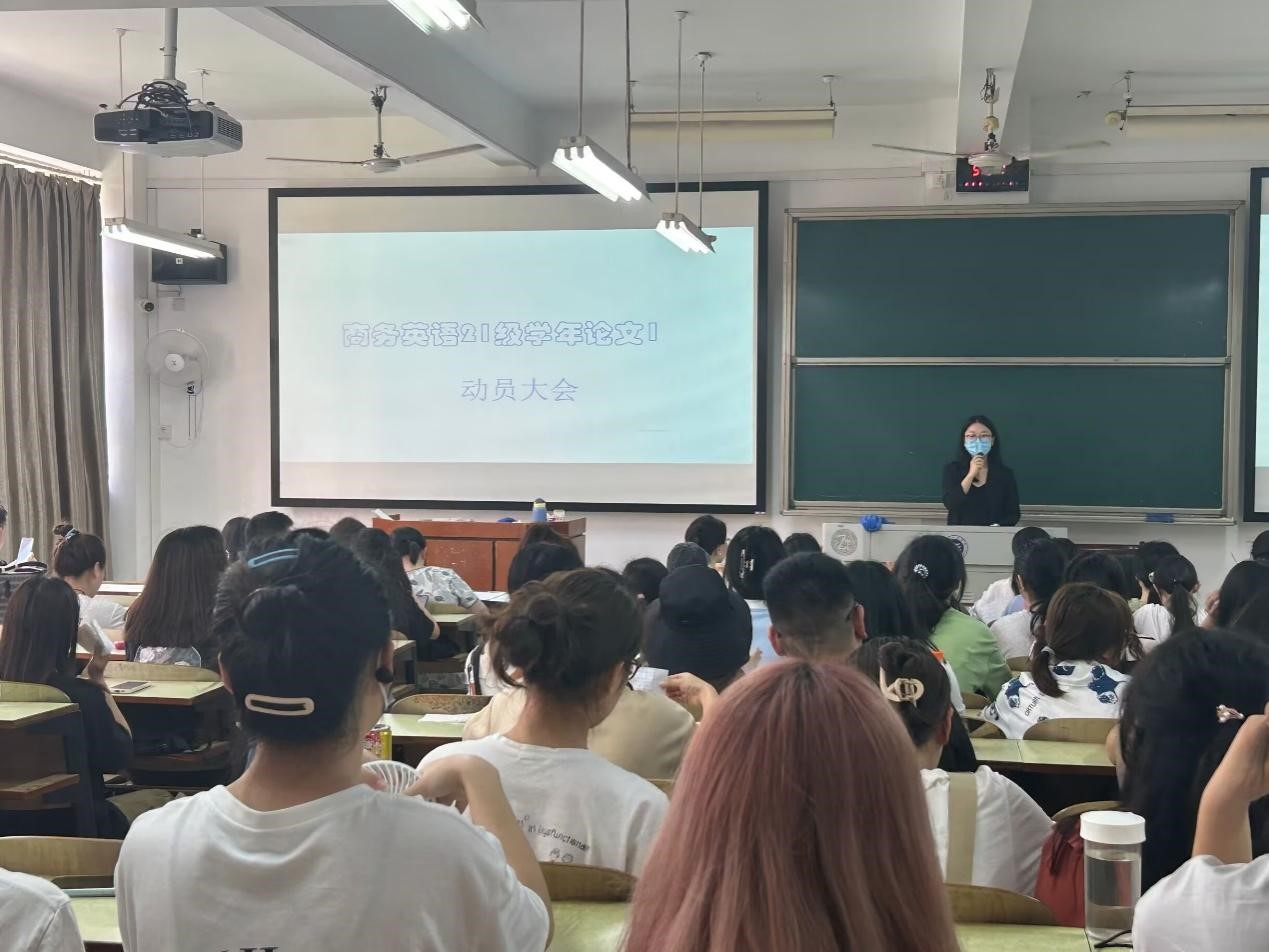 2023年5月29日,商务英语专业2021级学年论文1实习动员大会于D203召开。参与本次会议的有各班指导老师以及商务英语专业2021级全体同学。