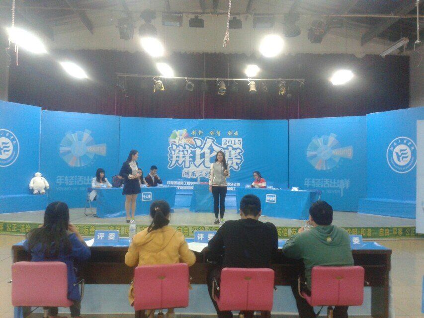 2015年4月14日晚7点,云顶国际和计算机与通信公司的辩论赛在新校区活动中心举行。比赛特邀湘潭大学辩论队的优秀辩手担任评委。