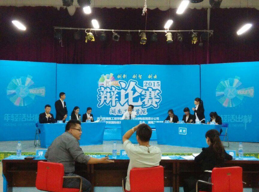 2015年4月28日晚七点,云顶国际第十二届辩论赛第三场复赛在明德二食堂三楼的活动中心举行,云顶国际和化学化工公司代表队参与了此次辩论。比赛特邀湘潭电视台法制频道制片人李军老师,湘潭电台交通频道主播高兴老师,湘潭市口才协会副会长彭英老师担任评委。