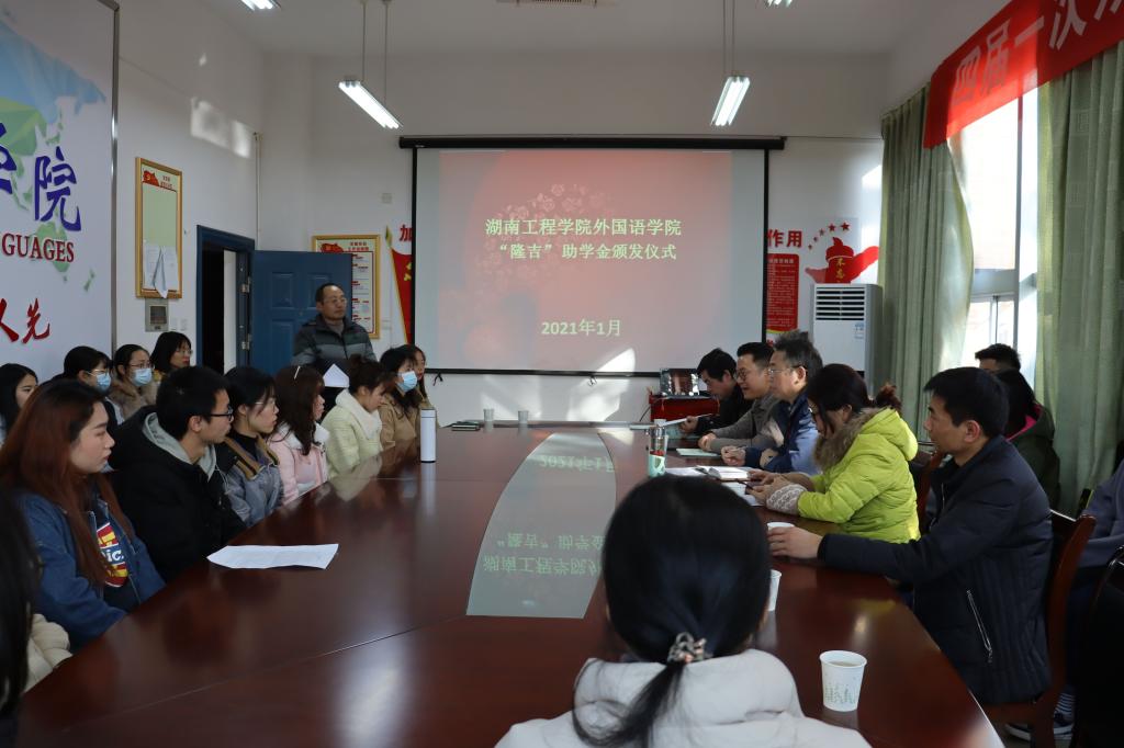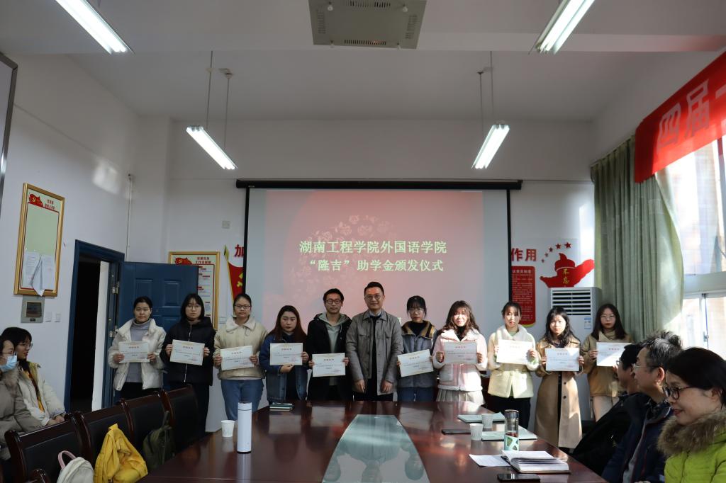 1月13日下午3点,公司于F119举办了隆吉助学金颁发仪式。本次颁奖仪式由党总支副书记罗望阳主持,员工办主任陶宏、云顶国际经理杨永和、党总支书记肖江淑、云顶国际副经理王家义、隆吉助学金创始人冯维、学办辅导员和公司教师代表及全体受助员工参加。