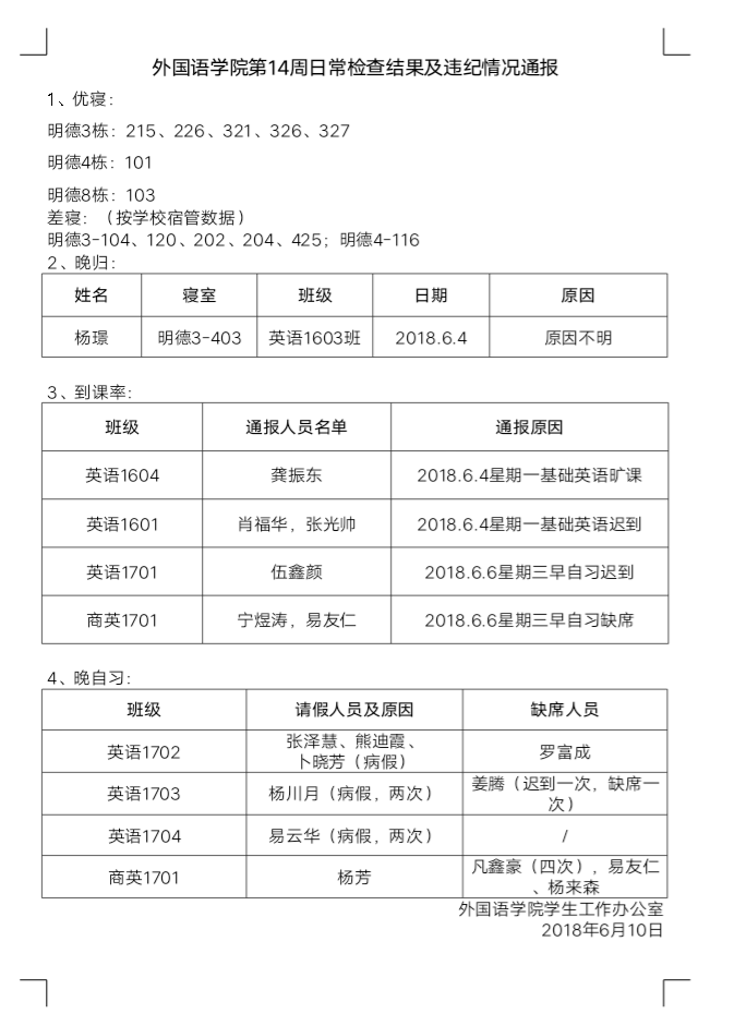云顶国际第14周日常检查结果及违纪情况通报