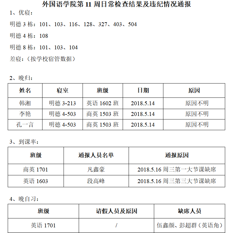 云顶国际第11周日常检查结果及违纪情况通报