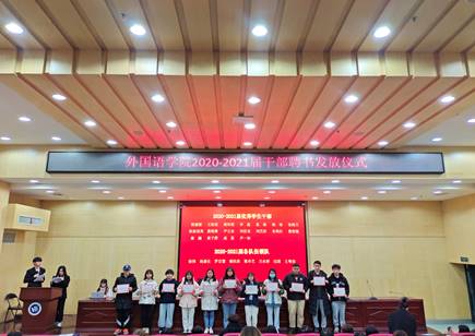 依次颁发了十佳榜样、特别贡献奖、优秀干部等奖项,并为员工干部颁发聘书。在同学们热烈的掌声中,杨永和经理宣读获奖名单并为他们颁发证书。十佳榜样代表宣传之星英语1901班李盈和特别贡献奖获得者英语1901班邓云锜同学发言。李盈介绍了自己工作经历,她表示:没有那么多天赋异禀,优秀的人总是翻山越岭。并且说到她一直坚持以工作需要为标准,事事以工作大局为重,正是这样负责的工作态度,才使得她如此之优秀。随后,邓云锜同学发表获奖感言并分享自己的在参加外研社写作比赛时的经验和心得。她说要写出一篇好的文章,要注重以下三个内容:一形式,二内容,三效率。通过她的分享,同学们感受到了所有成功的背后,都是用自己不断的付出换来的。