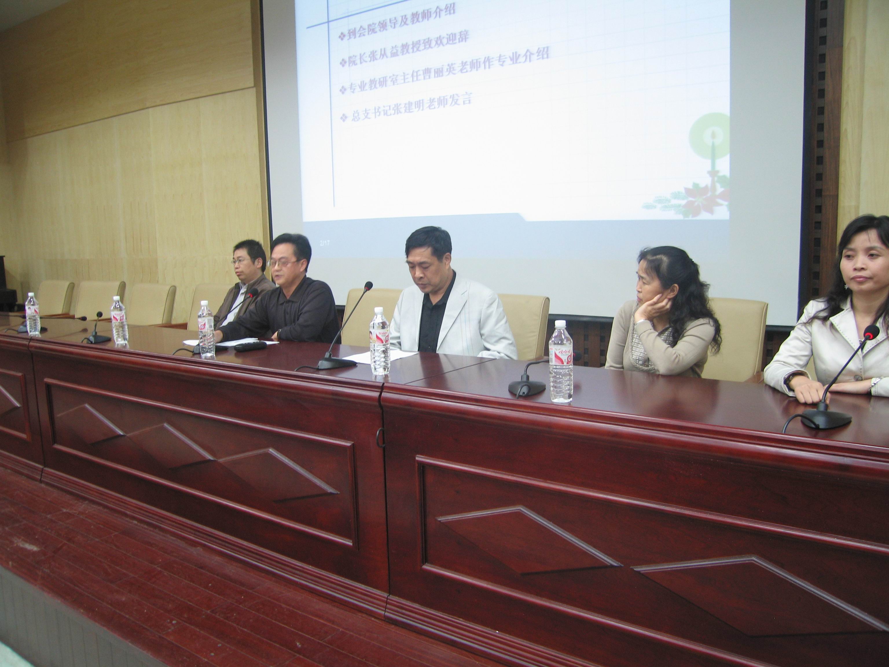 会上,主持人首先介绍了院领导及与会的各位老师,然后由经理张从益教授用英文向2009级新生致欢迎辞,接着由专业教研室主任曹丽英老师为同学们进行详细地专业介绍。最后,公司党总支书记张建明老师对新生怎样度过老员工活进行了指导。他向新生们讲解了“为什么上大学?”、“上大学学什么?”、“怎样上大学?”等刚入学的新生都会遇到的问题。