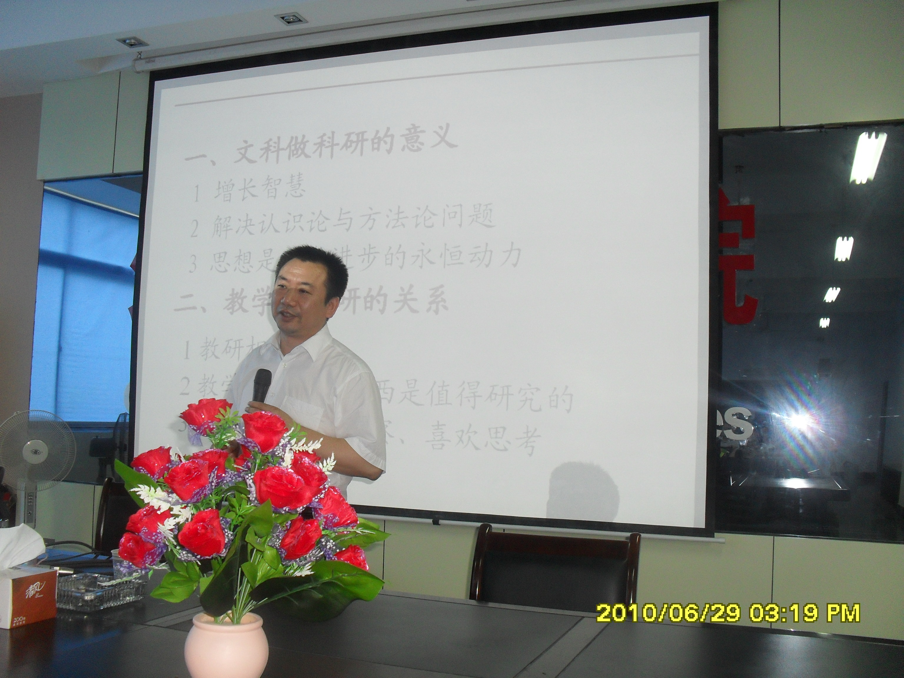 刘教授的报告包括六个方面的内容:文科做科研的意义;科学与科研的关系;阅读:科研的基本前提;观察、思考、发现问题;新观点、新视角、新方法:科研创新的基本要求;写作:走向成功的有效途径;细节:成败的关键要素之一。刘教授结合自己的教学科研经历,阐述了外语学科教师处理好教学与科研关系的重要性。学术报告例证丰富,贴近外语人的实际,富有启发性和指导意义。