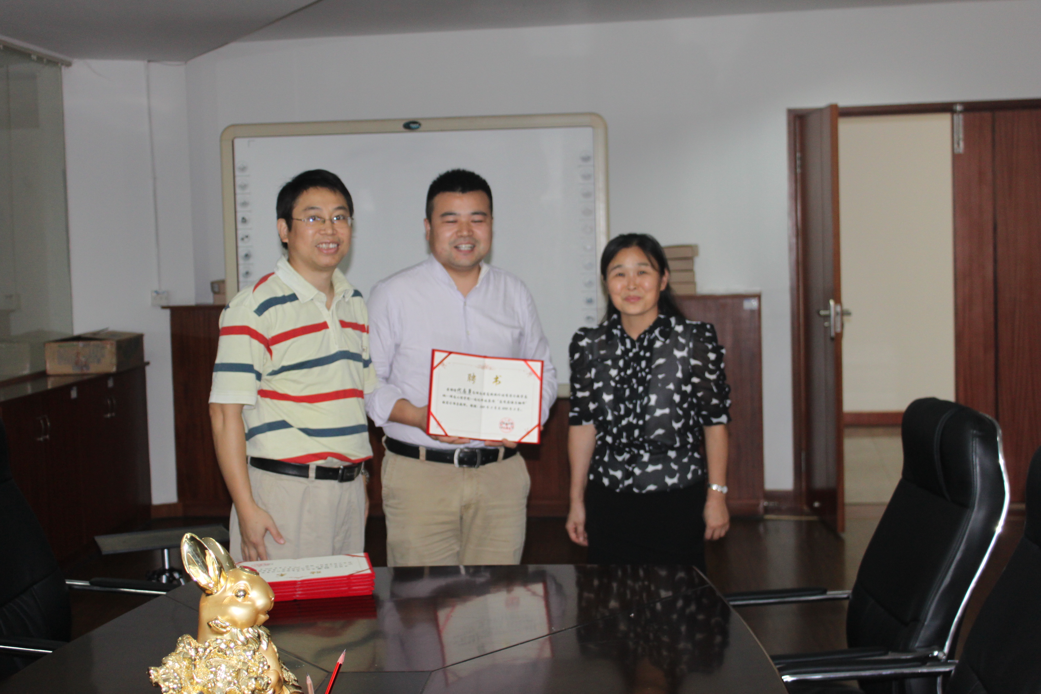 为了加强湖南省高校校外优秀实习教学基地---迅达科技集团“应用英语与翻译” 的建设、规范实践性教学环节和提高实践性教学环节的的效果,2013年10月10日下午,云顶国际经理杨永和、副经理刘向红和王家义率商务英语专业教研室部分教师前往迅达科技集团股份有限公司为指导教师颁发了聘书。