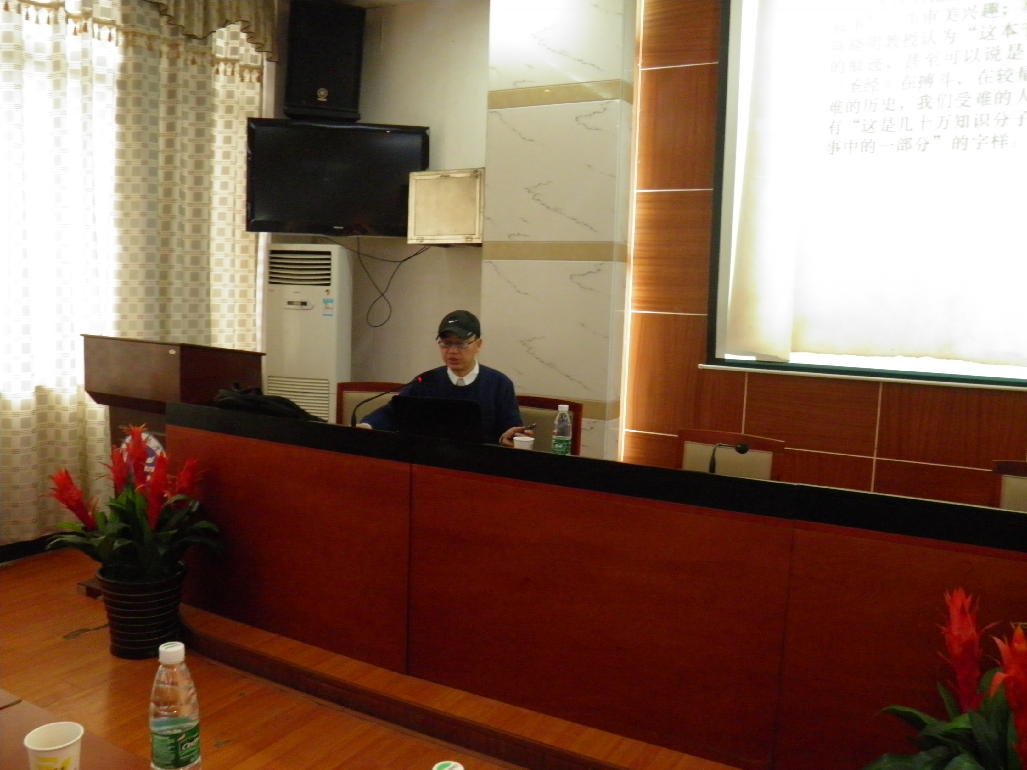 首先,胡安江教授做出精彩报告。他热情地与大家畅谈文学作品语言、内容之外的东西,让大家了解中国现当代文学,尤其是中国文学在海外的的传播与研究。他以徘徊在受欢迎和被争议之间的的话题作家阎连科的作品为例,让大家体会到一位精力充沛、悲天悯人和开拓创新的作家对中外文化翻天覆地的影响,引人深思,让人受益匪浅。他提出为了让中国文化得到更广泛、更全面地传播,中国译者应以目标读者的主流诉求为主,采取“中西合译”模式以及“异”“同”结合的翻译传播策略,使中国文化在世界文化之林大放光彩。