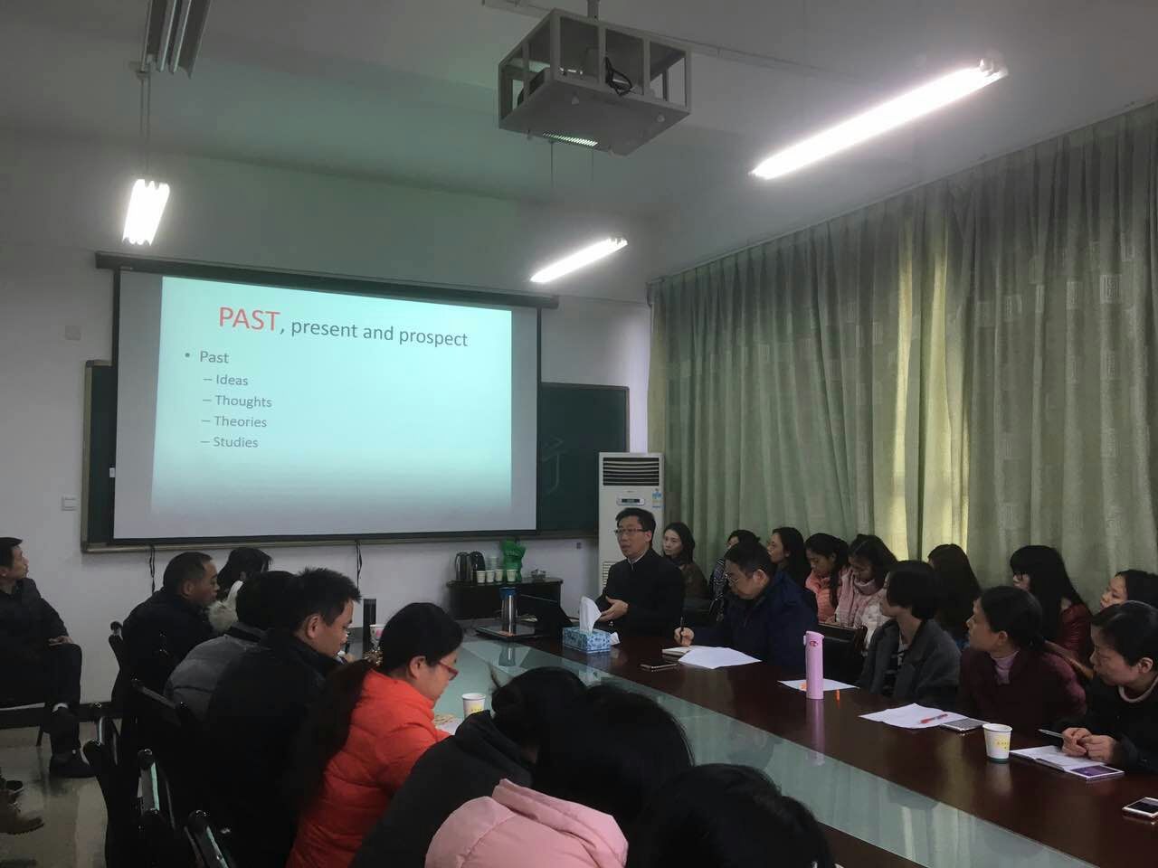 杨永和主持学术活动,院级重点学科各方向主要负责人、英语学科骨干教师及部分专业员工参与聆听。