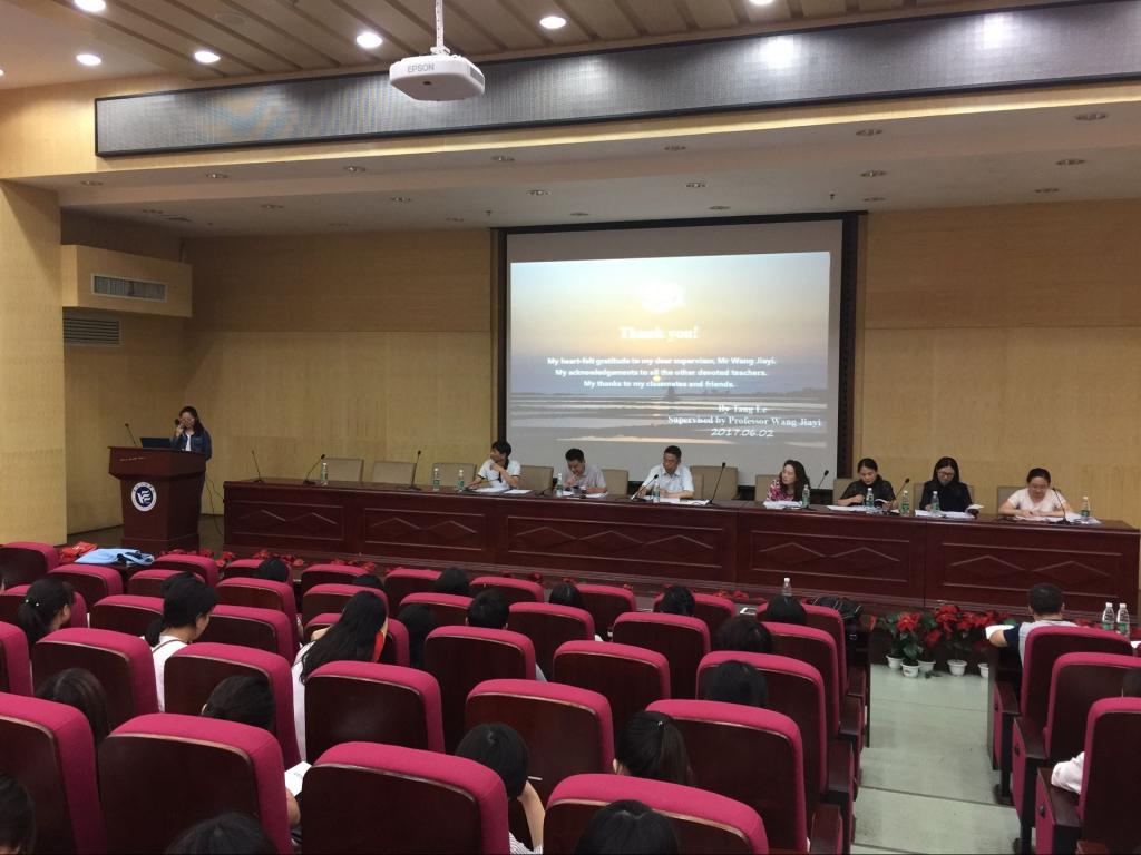本次答辩委员会由杨永和、罗胜杰、王家义、毛帅梅、彭禹、曾宇钧、朱洁等7名成员组成,英语专业唐乐、刘蕊、张艳菊、何艳和姚芬等5位同学分别进行了精彩答辩。她们通过PPT演示,分别就论文写作背景、目的、意义及内容等方面进行了陈述,并认真听取、回答了评委老师就论文选题、理论框架、研究方法等方面所提出的问题。随后,杨永和进行总结,他首先对参与公开答辩的员工提出表扬,然后就提高毕业生论文和答辩水平提出几点建议:第一,重视文献的力量,善于借力;第二,参考文献应以权威学术期刊与专著为主;第三,论文写作一定要规范,严格遵照模板要求;第四,答辩需充足准备,综合能力见分晓,尤其口语能力需提高;第五,要求指导老师严把质量关,做到“三心”(细心、耐心、恒心)合一。
