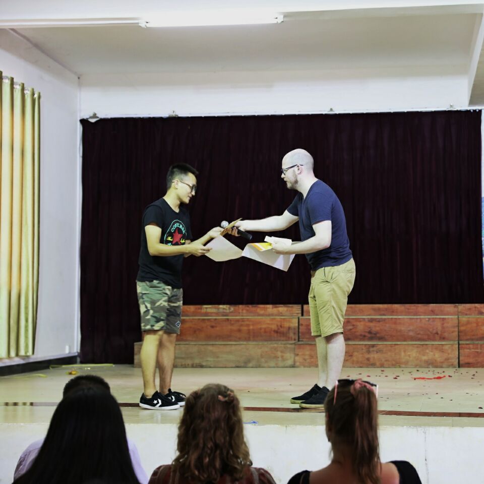 实习期间,同学们以小组为单位在全国最大的英语角——阳朔西街与外国友人们进行交流,地道的语言素材与真实的语言环境给了同学们不一样的体会,学会主动交谈,这也激发了同学们对外语的学习动力。13日下午,在阳朔公园内的老年大学举行了话剧大赛,观赛的不仅只有本校的老师及同学,同学们还邀请了在当地旅游的外国朋友前来观看本次话剧比赛,比赛期间,同学们各具特色的表演引的现场阵阵掌声与欢呼声。