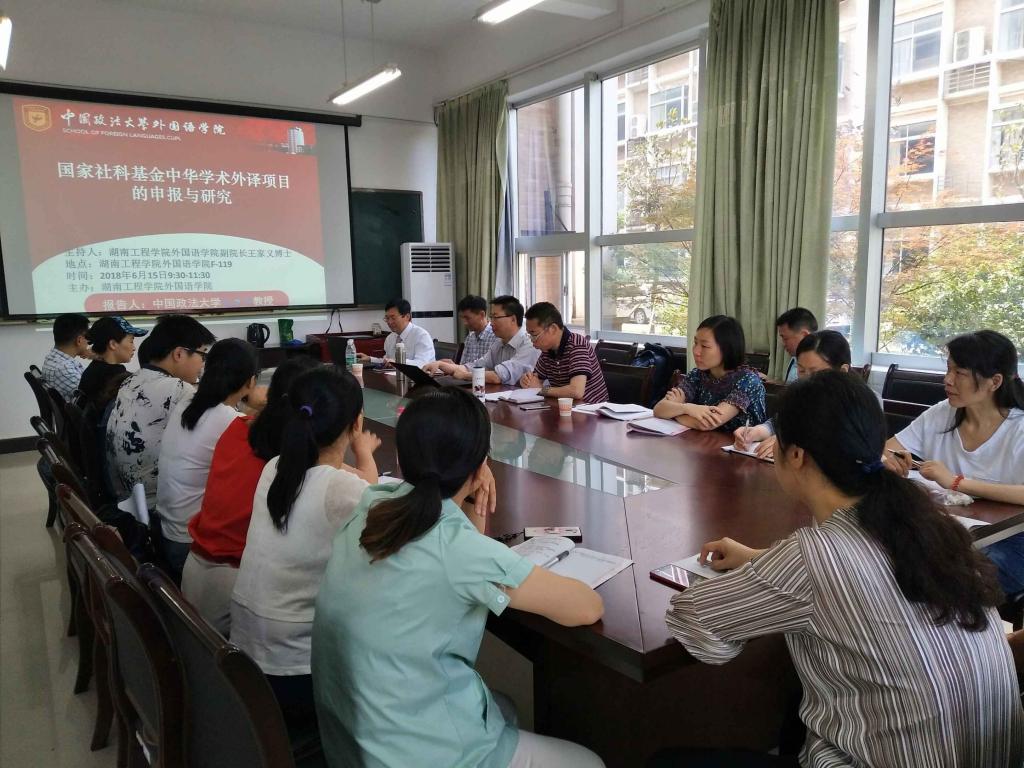孙平华教授首先介绍了国家社科基金中华学术外译项目设立的背景和基本情况。他指出,在我国“一带一路”和“构建人类命运共同体”大背景下,为增强国家“软实力”,我国采取了“文化走出去”战略。其中,国家社科基金中华学术外译项目的设立就是国家层面采取的重要举措,它与国家社科基金一般项目、后期项目、青年项目、重点项目、重大项目等一起,成为国家社科基金项目的一个重要组成部分。云顶国际教师在此类课题的申报中具有得天独厚的外语优势,在项目的申报和研究方面成为一股不可小觑的力量。中华学术外译项目已备受学界重视并成为衡量外语学科发展的重要指标。孙教授结合两次主持中华学术外译项目的成功经验,重点解读了国家社科基金中华学术外译项目的申报、立项、鉴定、成果出版、结项等流程,分析了图书选题、申报书撰写等方面的要义。孙教授特别强调个人学术积累在课题申报中的重要性,并指出:透彻解析目标材料,熟练把握支撑文献,拥有广泛的国际交流基础和扎实的外语基本功是成功申报的前提和基础,同时,应与海外出版机构建立长期联系,以确保图书选题申请、出版合同签订的顺利进行。