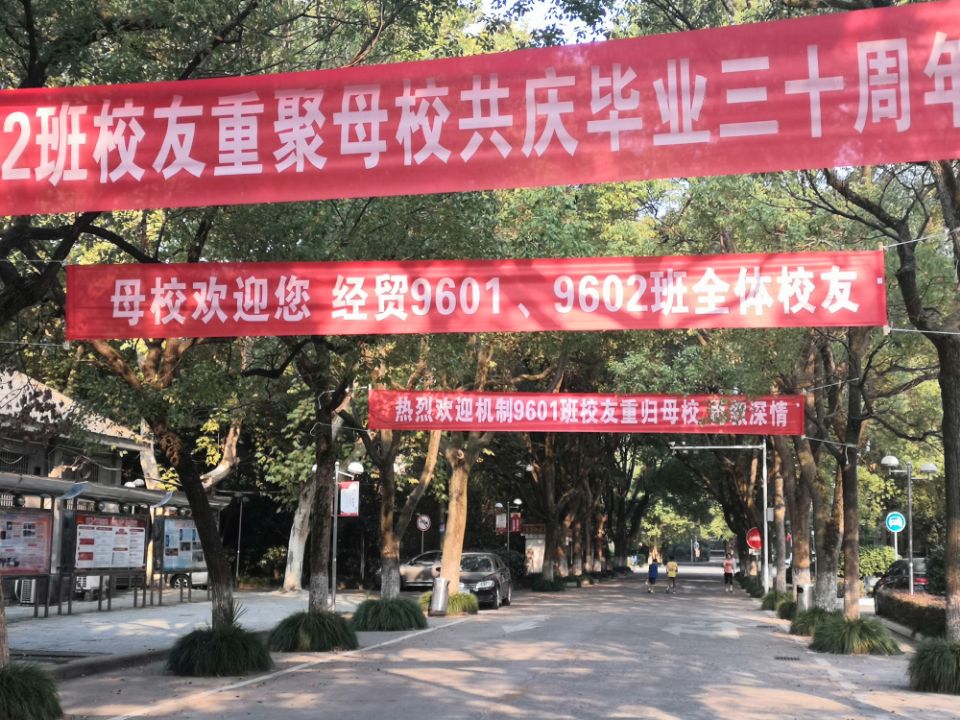 这是一个梦圆的时刻。10月4日上午,经贸英语96级员工与师生盼望已久的毕业二十周年聚会第一场活动如期而至,同学们一大早就来到昔日学习生活的南校区。见到昔日熟悉的下摄司街、焕然一新的校门的瞬间,很多同学都留下了激动的泪水。年已不惑的员工们一进校园仍然像个孩子,一个个都精神抖擞、生龙活虎起来。公司、公司的准备工作早已做好,欢迎横幅揭示着隆隆的喜庆氛围。当年的班主任李儒峰、唐心洁老师早已在校园内迎接返校员工,全程陪同。体育老师刘娟妮给大家上了一堂体育课,烈日炎炎之下大家玩击鼓传花、比拼平板支撑,还进行了一场男子篮球友谊赛,女生们还是象以往一样当啦啦队的小迷妹;回到第一教学楼,七十多岁的语文老师孙立湘教授给大家上了一节演讲与口才课,课前十分钟进行新闻播报,直接把每个同学的思绪拉回到二十年前。中午,大家回到当年的食堂用餐,品味美食,回味老员工活。中午,部分同学去老师家排练朗诵,为晚上师生表演进行准备。部分同学进入当年的宿舍,体验集体生活,感受母校情谊。