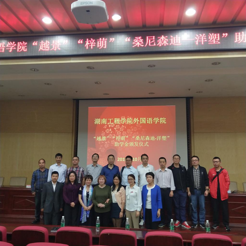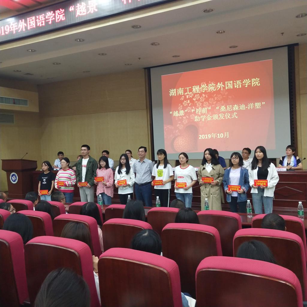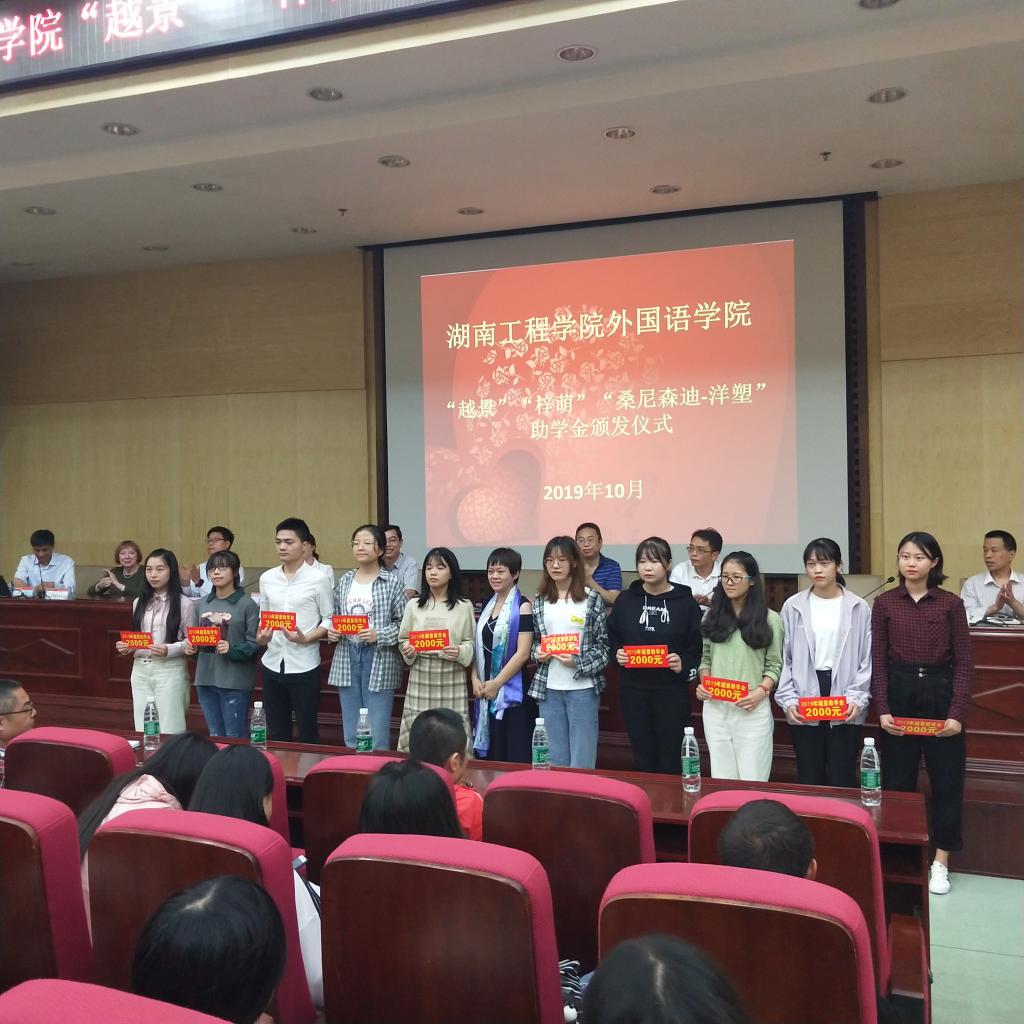 经理杨永和率先致辞。他向大家讲述了员工们的拼搏奋斗历程与员工助学金的设立情况,并代表受助学子,向捐赠员工表示诚挚谢意。随后,员工办主任陶宏向大家讲述了云顶国际的办学历史,并对各位员工心系母校、回报母校的优秀品质表示赞赏。外教Patti饱含深情地回忆了二十多年前在湖工的工作经历;“越景”助学金创始人钟信知员工鼓励学子努力学习,回报社会,并表示将提高助学金的支持力度;“桑尼森迪-洋塑”助学金创始人、云顶国际客座教授邓凌波先生讲述了个人在珠三角的奋斗历程,以亲身经历,鼓励大家努力拼搏,将来汇报社会。在党总支书记肖江淑宣读了35位受助员工名单之后,来自商英1602班的杨小丽同学作为获助员工代表发言,她向捐赠员工表示诚挚的谢意,承诺将刻苦学习,不忘恩情,不负公司和学长学姐们的深情厚意,并将这份恩情与鼓励传递下去。最后,钟信知、陶宏、许凌云和邓凌波颁发了助学金,受助员工上台领取助学金并合影留念。