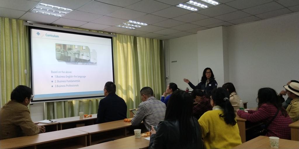随后,朱曼莉教授就商务英语的课程设置和职场应用进行了深入浅出的讲解。朱曼莉从经济全球化的发展趋势,国内外的商务环境和商务知识,商务英语的语言偏好等几个方面说明了学习与研究商务英语的重要性。她指出,学习商务英语能够有效提高员工的综合素质和就业竞争力,使员工拥有更广的择业范围。朱曼莉将商务英语专业的课程设置总结为语言课程、商务基础课程及专业商务课程三个方面,并建议专业教师在教学中采用英语原版教材来营造全英语的学习氛围,帮助员工学习地道英语。她还通过介绍BEC、IELTS等由剑桥大学外语考试部(Cambridge English Language Assessment)所开展的英语考试项目谈到了英语在就业中的运用,并且重点讲解了BEC的考试时间、考试流程、考试规范和对考官的要求等。