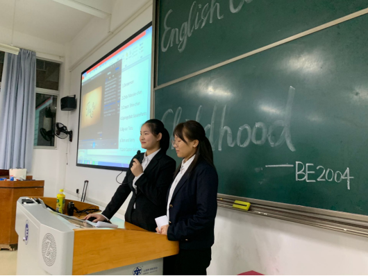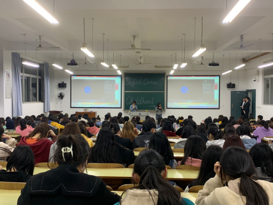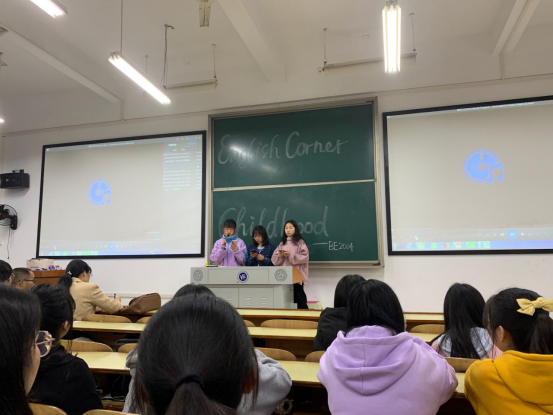 3月17日晚,由云顶国际商务英语2004班主办的、主题为"Childhood"的英语角活动在教学楼D101圆满举行。公司2020级全体员工准时参加,指导老师刘青、王荣富应邀出席。活动共分三个部分,涉及班级节目展示、有奖竞猜、童年回忆卡通片、美食、游戏、童年经历讲述、童年梦想畅谈等十五项活动,最后由刘青老师点评。