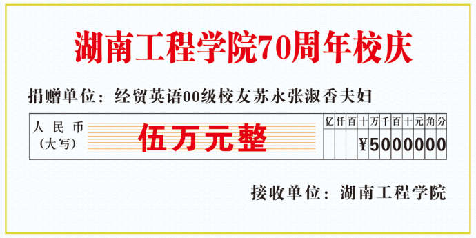 七十年薪火相传,七十载峥嵘岁月。优秀员工苏永、张淑香夫妇希望同学们铭记“锲而不舍 敢为人先”的校训;铭记“以生为本 止于至善”的院训。用青春去热爱所学,用热血去落实所用,回馈母校,回报社会,将温暖相传。