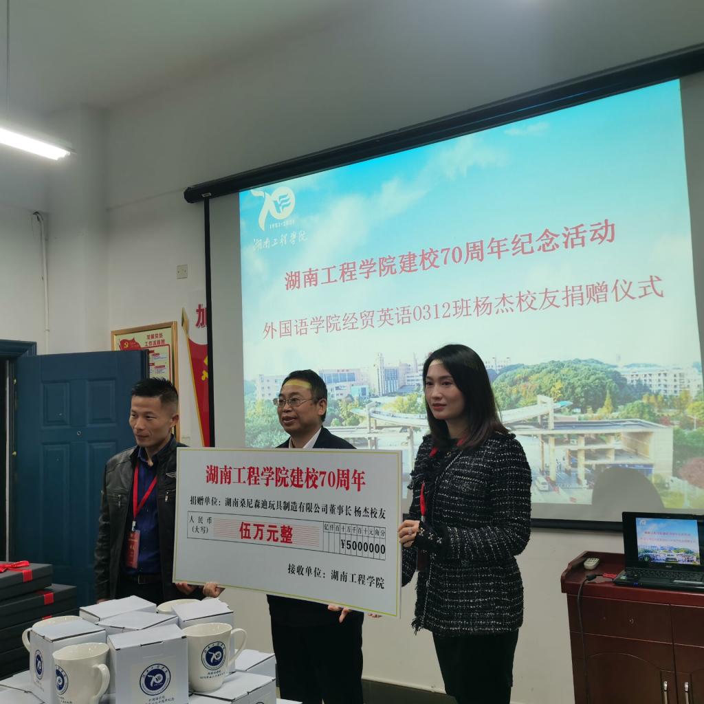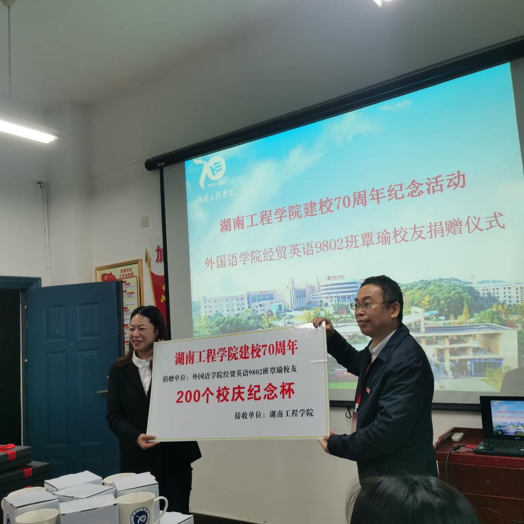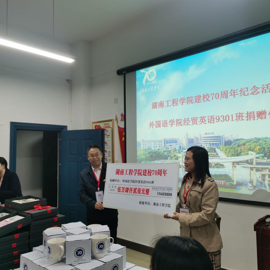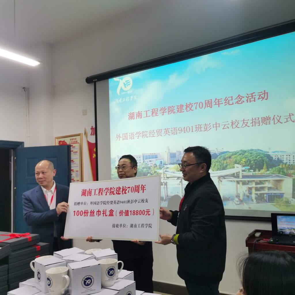 仪式上,经贸英语9301班文丰代表班级捐赠54200元;经贸英语0312班许展和刘倩雯代表杨杰员工捐赠50000元;经贸英语9401班洪庆华和杨东代表彭中云员工捐赠价值18800元的丝巾礼盒100份;杨永和经理代表经贸英语9802班覃瑜员工送上200份校庆纪念杯。陈亚琼代表公司再次表示感谢:员工们的捐赠,都是心的表露,情的凝聚,饱含的都是湖工学子对母校浓浓的爱。