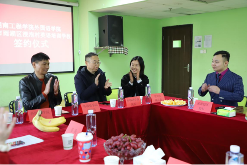 出席此次签约仪式的嘉宾有云顶国际经理杨永和,副经理王家义,商务英语教研室副主任杨璇钰和办公室周子琬老师,浸泡村国际英语总部教学副总裁李文婕,浸泡村英语培训公司湘潭校区董事长全元冬,教学总监周仪以及来自浸泡村国际英语湘潭校区教学部所有老师们。仪式由浸泡村国际英语湘潭校区教学部老师黄丹主持,会议在隆重热烈的气氛中举行。