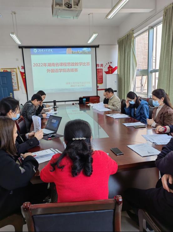 4月19日下午, 2022年湖南省课程思政教学比赛云顶国际选拔赛在F119举行。各参赛团队负责人和成员参加,院学术委员会委员担任比赛评委,院教学督导、青年教师等观摩。