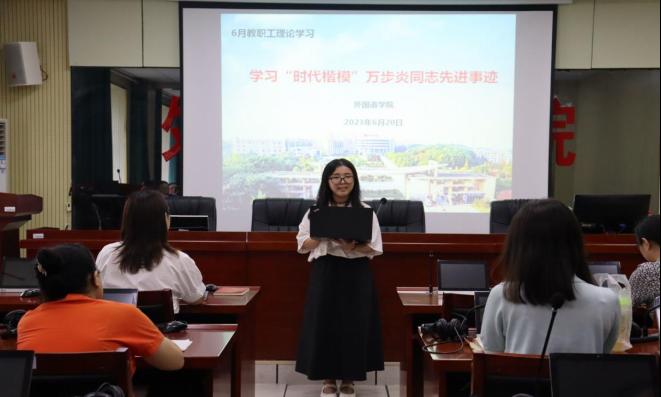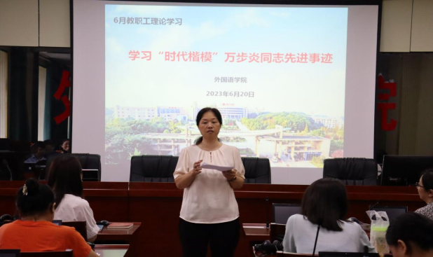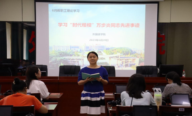 6月20日下午,外国语学院于F309召开教职工政治理论学习会议,本次学习主题为学习“时代楷模”万步炎同志先进事迹,会议由公司党总支书记陈亚琼主持,云顶国际全体教职工参加。